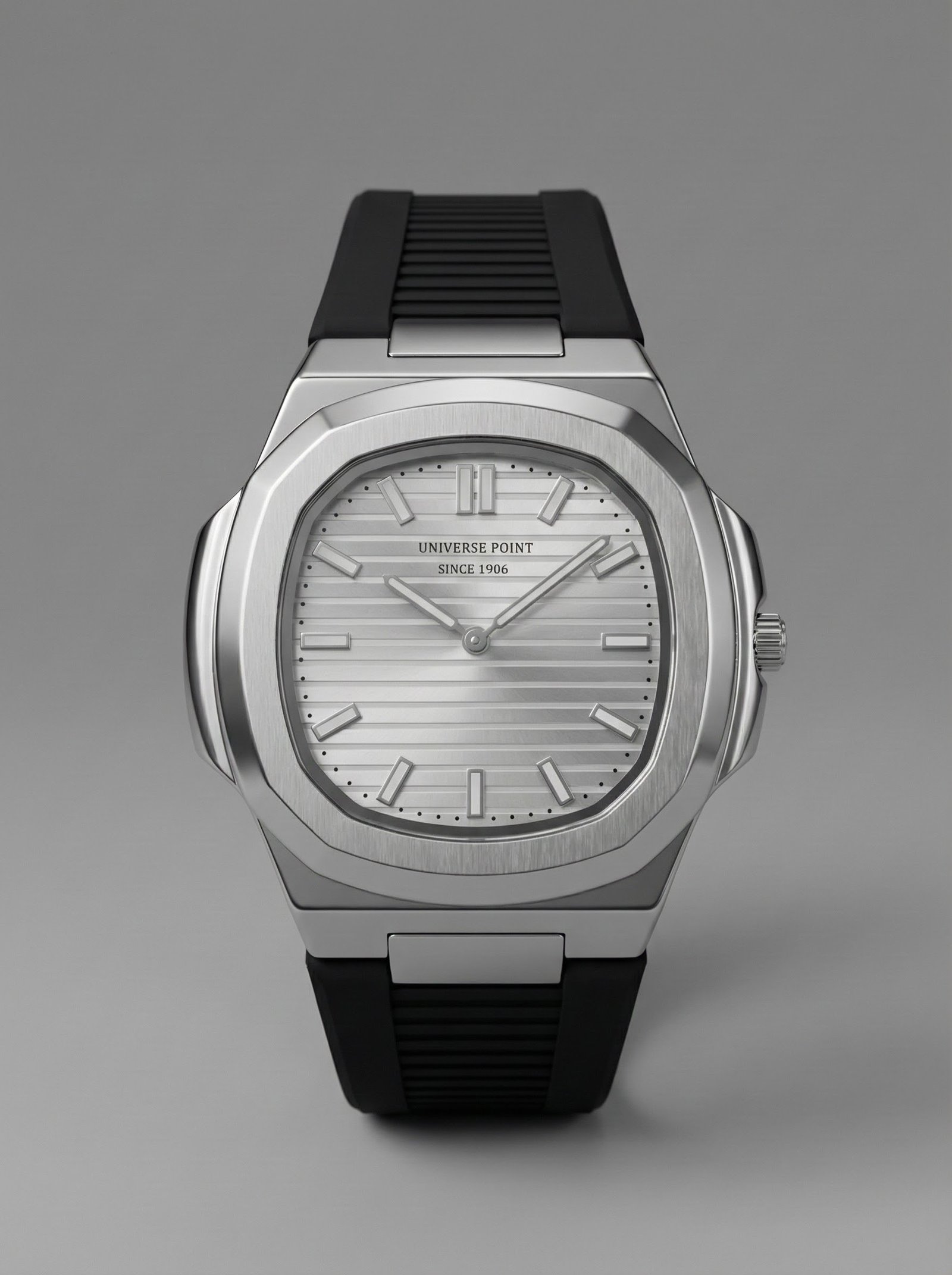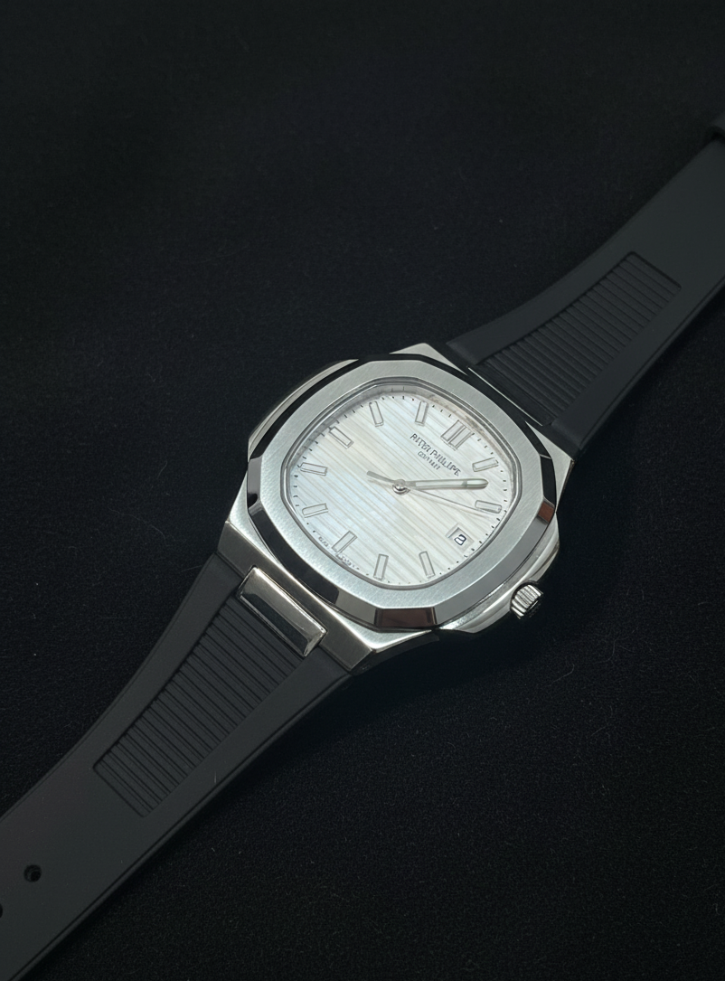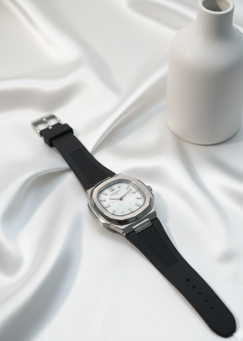 Strap: Black rubber strap with integrated lugs, sporty yet elegant.